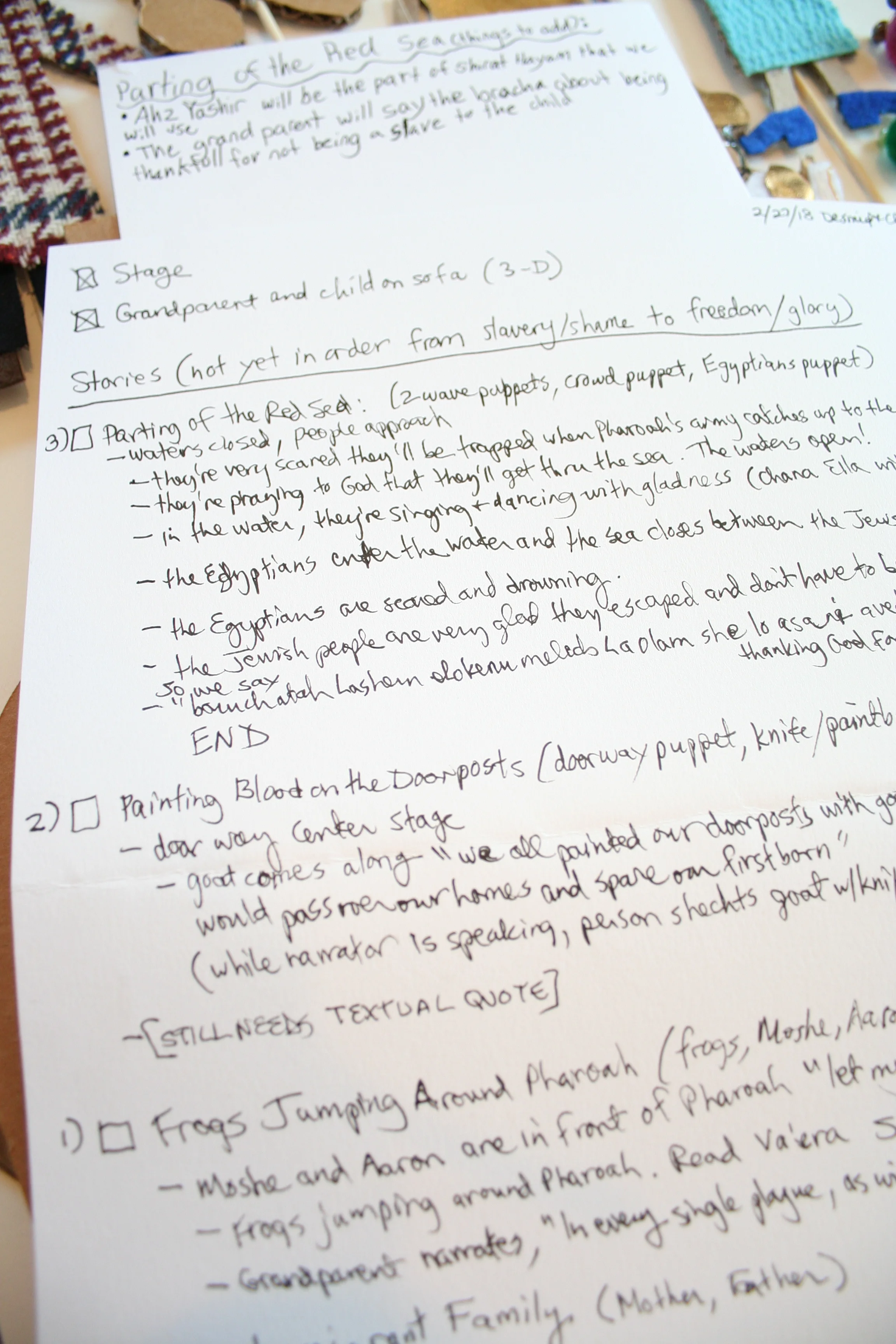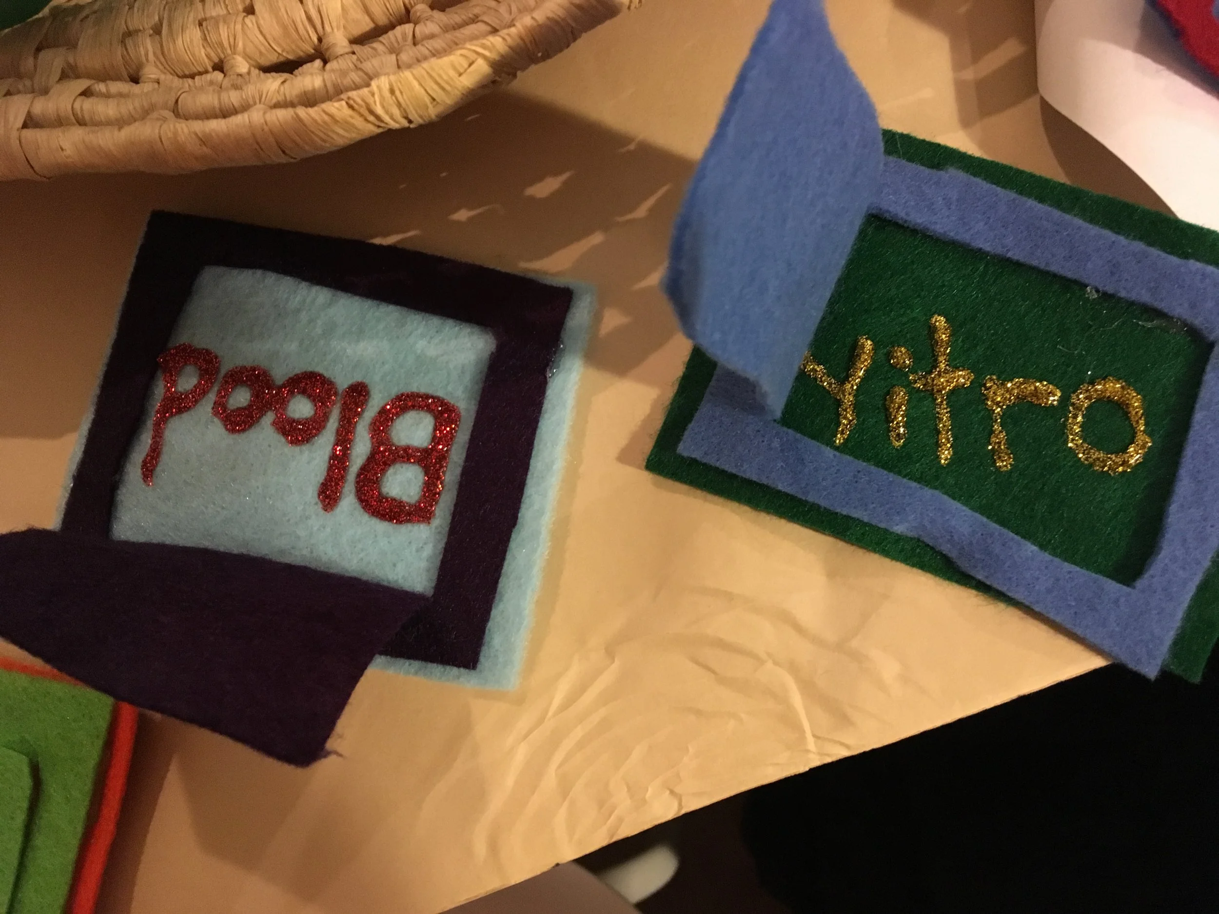 The other projects were inspired and amazing but slightly less sharable in print-out form. Chana Ella and Desmid created a shadow puppet theater, in which a grandparent tells the Pesach story to a grandchild, by way of shadow puppets. They created all the puppets and wrote out scripts for each scene. One interesting aspect of their work was that the shadow puppets were a lot more intricate and detailed than would be typical for that form. Desmid's response to my wondering about this: Since Chana Ella will be using this live at her seder, I wanted to really just enjoy the process of creating the components themselves, and putting a lot of care into the details