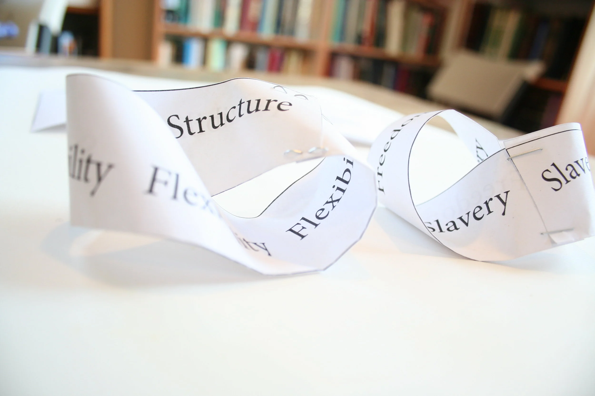 These mobius strips can invite seder participants to reflect together on the creative tension embedded in the seder and throughout Pesach. What is being asked of us when we're called to hold these dualities in our sights at once?