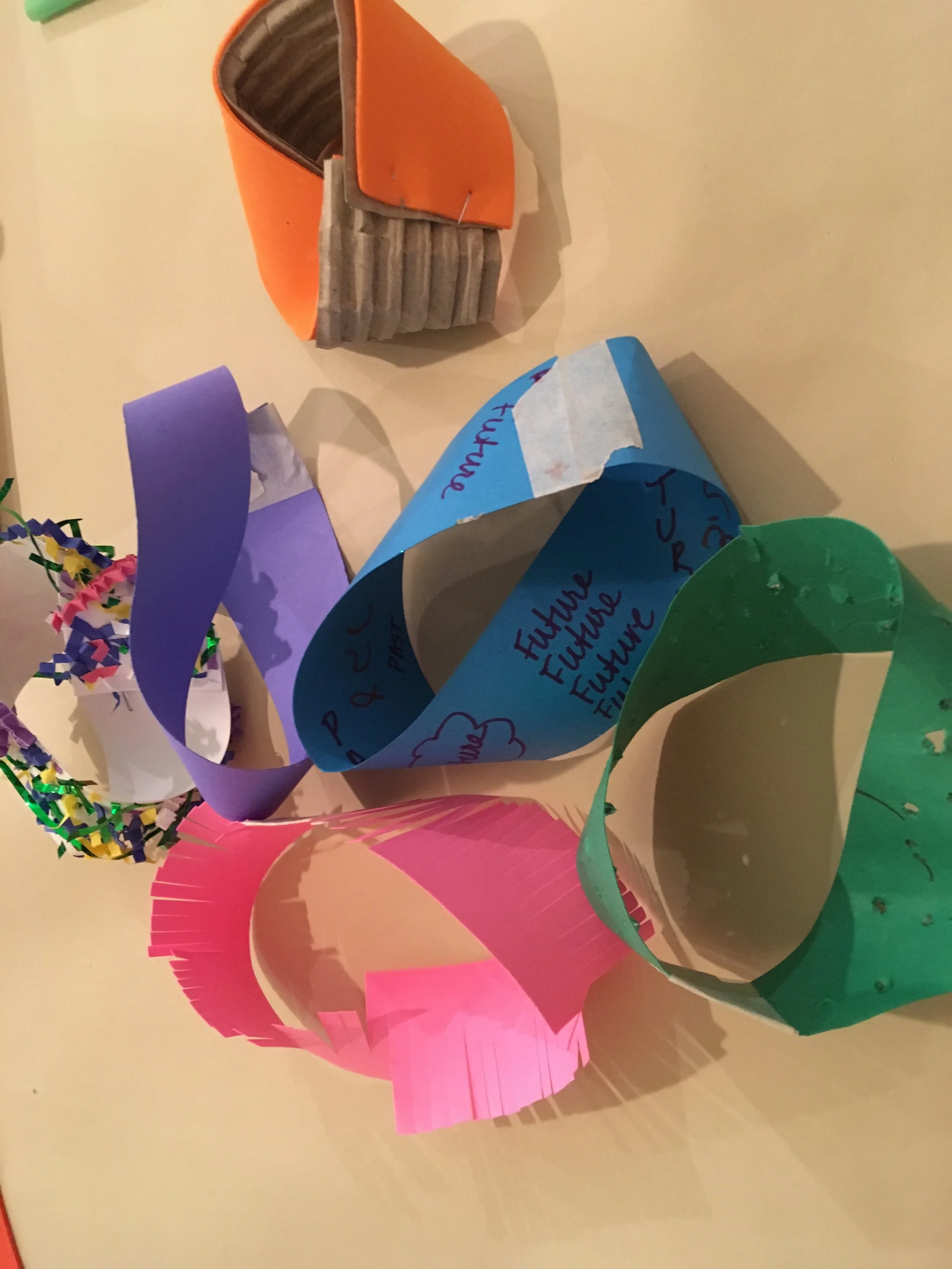 Ariel and Aliza created duality themed mobius strips. They had initially considered linking them all, having a chain where seder participants could hold each hold a link. In the end they created individual elements that could be placed throughout the seder table. The dualities they chose are: exile/redemption; slavery/freedom; future/past; pain/praise; nation/broader world; celebration/mourning; cleaning/mess; biblical/historical; structure/flexibility.