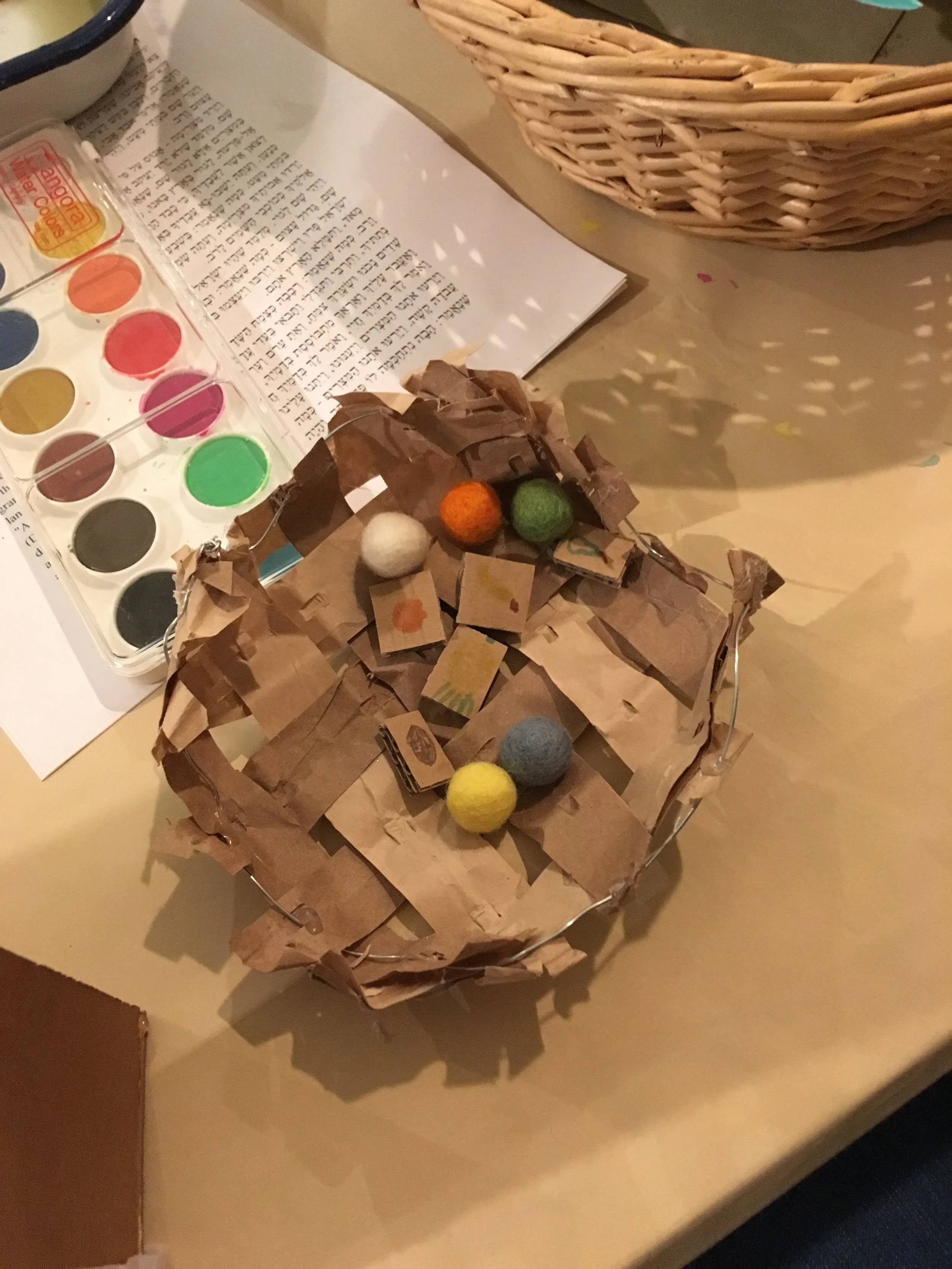 Mira and Eli were working on a few items, but the one that especially stood out was a woven basket, for people to pass around and share a blessing or wish for future blossoming. One of the themes we had tracked during the series was that some of the seder text is actually from the Bikkurim/first fruits declaration in the Temple. While we bring the first fruits at Shavuot time, we mark of the first flowers of the fruit trees in Nisan, the Jewish month that Pesach occurs in.