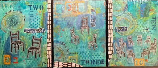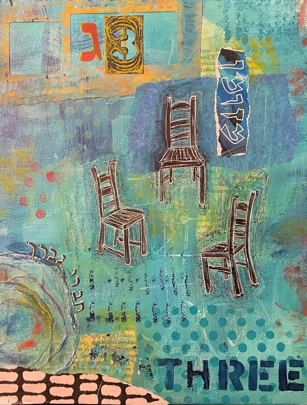 “Blessing chair” surrounded by “wings” of Shechina. The chair is accompanied by a triptych of collages, featuring chairs of varying numbers: 2 (havruta), 3 (mezuman), and then 10 (minyan), along with related blessings/hopes as we emerge and re-connect.