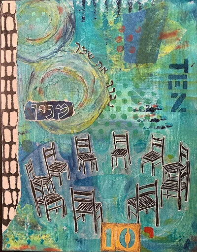 The third collage (with 10 chairs) represents a minyan, the quorum of Jews needed to recite certain prayers, such as Kaddish. If you are someone who has gone to a synagogue (or other house of worship) in the past, how has it felt to be “exiled” from that place during the pandemic? What have you missed? If you have participated in worship over Zoom, how was that experience different? How might it feel to return to the synagogue, or other communal space, and pray with one another in person again? What makes a makom kadosh, a holy space?